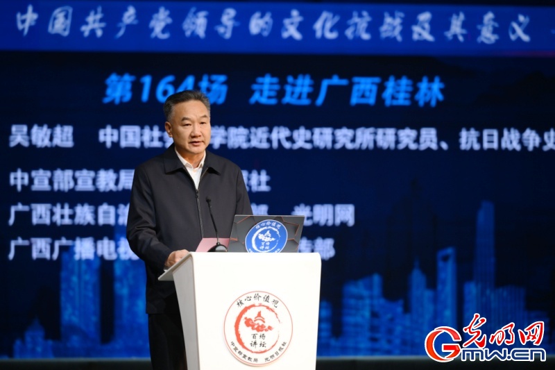 10月23日,由中宣部宣教局、光明日报社共同主办,广西壮族自治区党委宣传部、光明网承办,广西广播电视台、桂林市委宣传部协办的“核心价值观百场讲坛”第164场活动,邀请中国社会科学院近代史研究所研究员、抗日战争史研究室主任吴敏超,作题为《中国共产党领导的文化抗战及其意义》的主题演讲。图为广西壮族自治区党委宣传部副部长王晓华同志致辞。