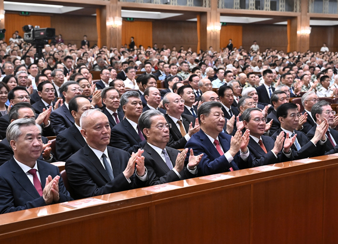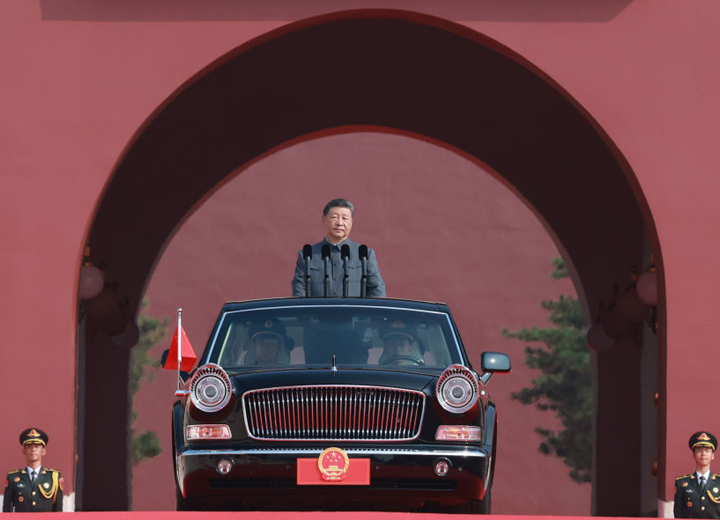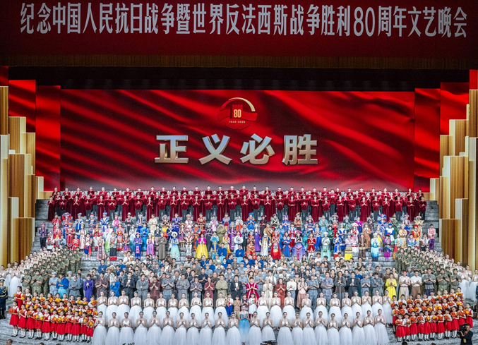 9月3日晚,北京,人民大会堂灯火辉煌。万人大礼堂的舞台上,金色长城蜿蜒起伏,赤红绸布飘动飞舞。幕布中间,“正义必胜”四个大字熠熠生辉。[详情]