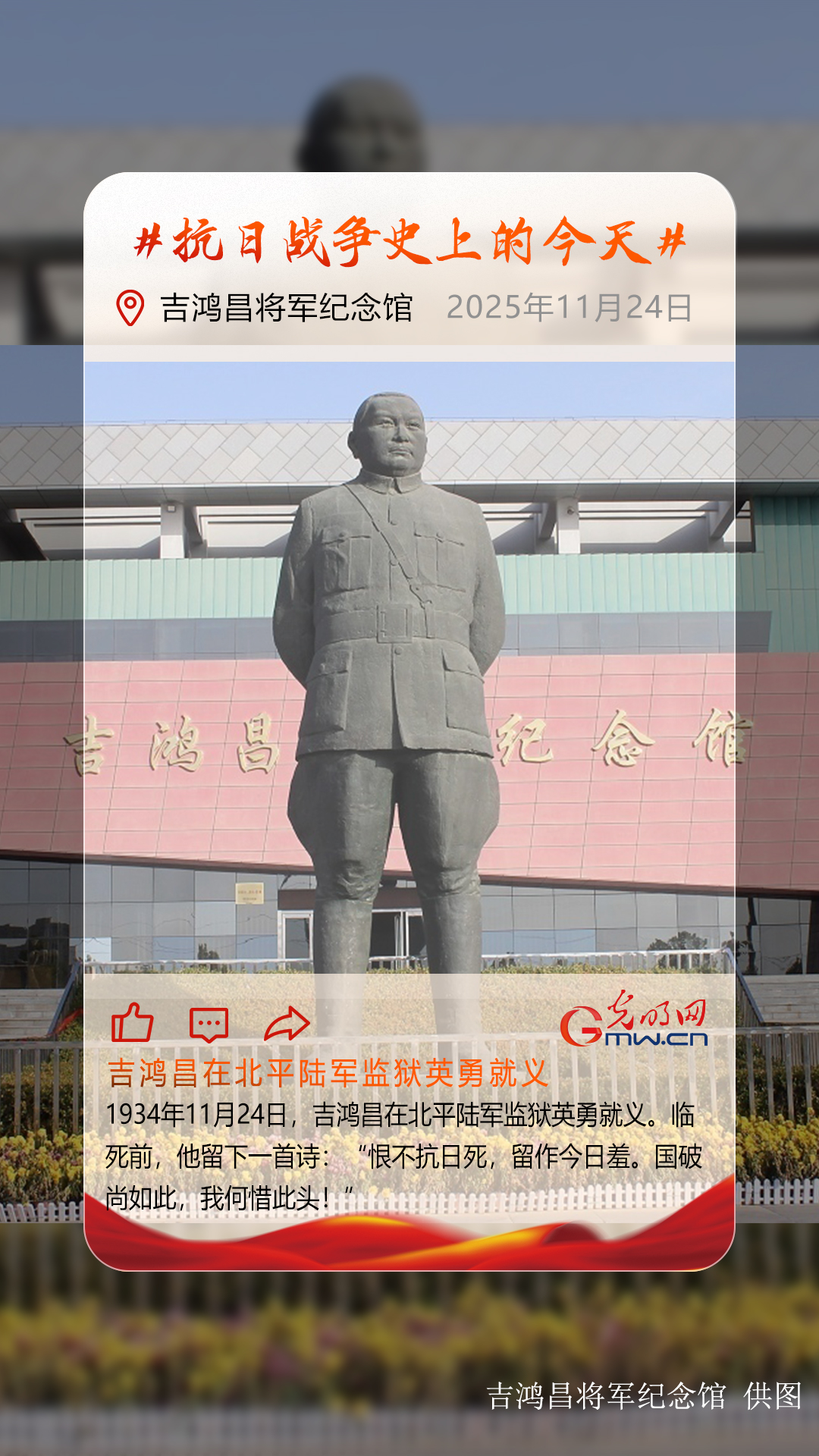 1934年初,吉鸿昌秘密潜回天津,组织成立了“中国人民反法西斯大同盟”,并被推为主任委员。同年11月9日,他在天津法租界国民饭店开展地下活动时遭到特务暗杀受伤,并遭法租界工部局逮捕,后被引渡给国民党政府。11月24日,蒋介石密令将吉鸿昌“就地枪决”。吉鸿昌从容走向刑场,他在雪地上写下——“恨不抗日死,留作今日羞。国破尚如此,我何惜此头!”表达了抗日未成身先死的遗憾和为国捐躯的壮志豪情。