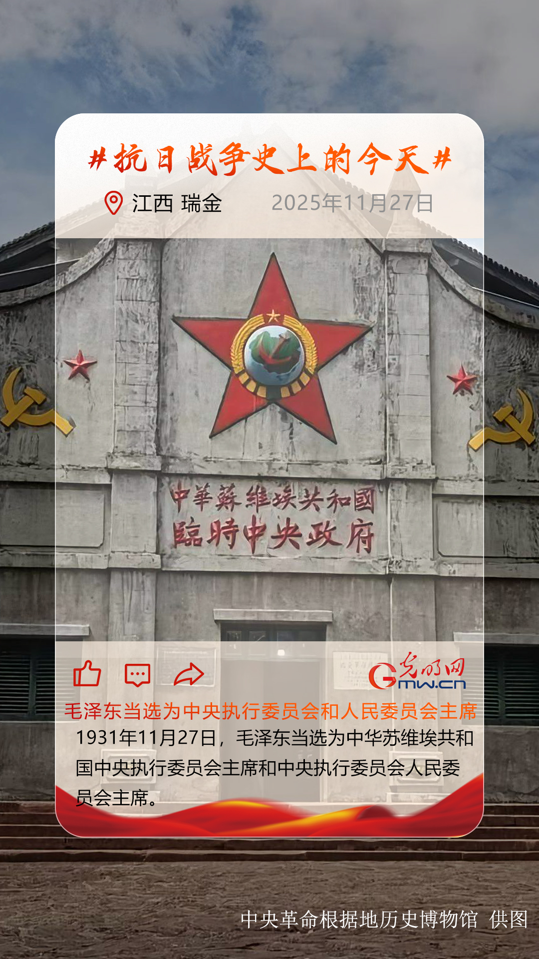 1931年11月7日-20日,中华苏维埃第一次全国代表大会在江西瑞金召开,宣布成立中华苏维埃共和国临时中央政府。27日,毛泽东当选为中华苏维埃共和国中央执行委员会主席和中央执行委员会人民委员会主席。中华苏维埃共和国是中国历史上第一个全国性的工农民主政权,是中国共产党在局部地区执政的重要尝试。