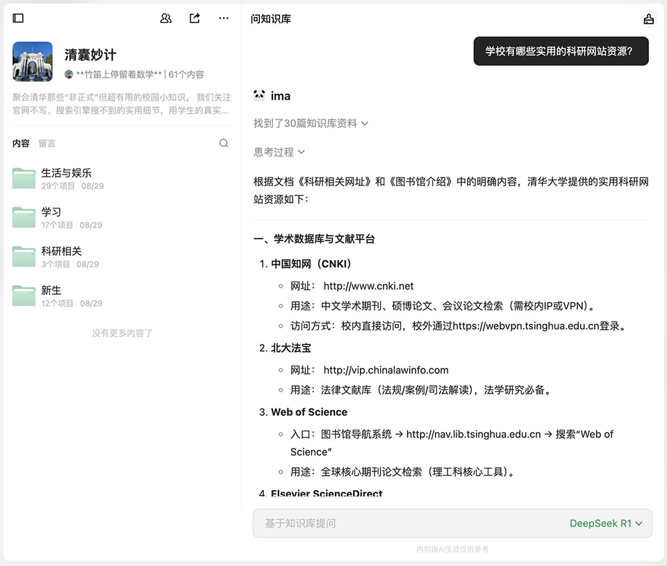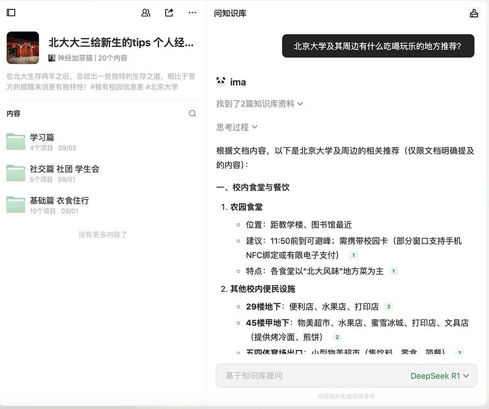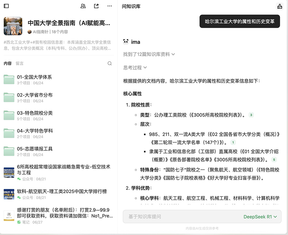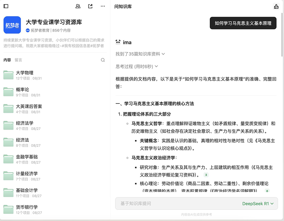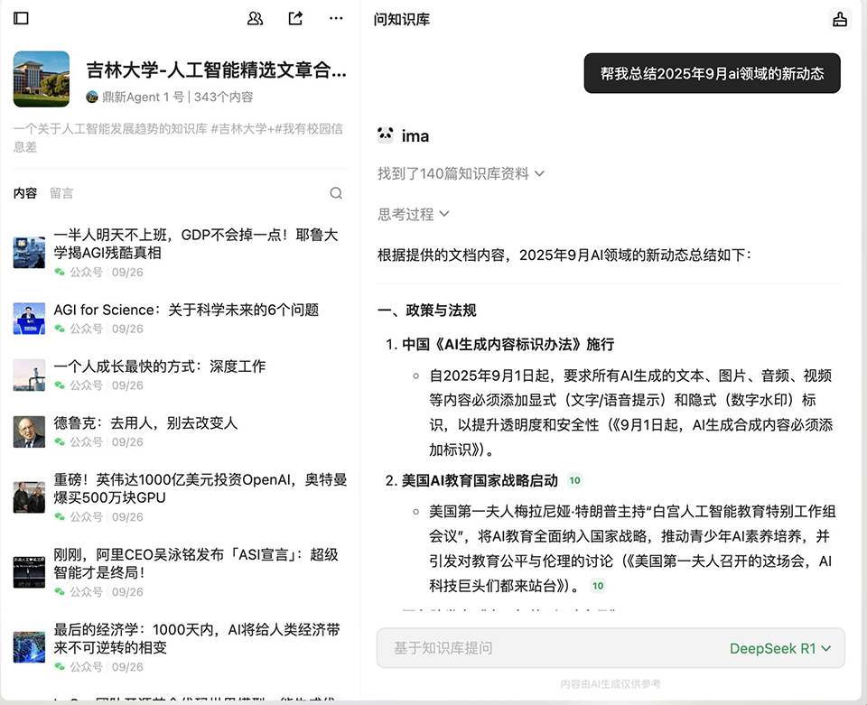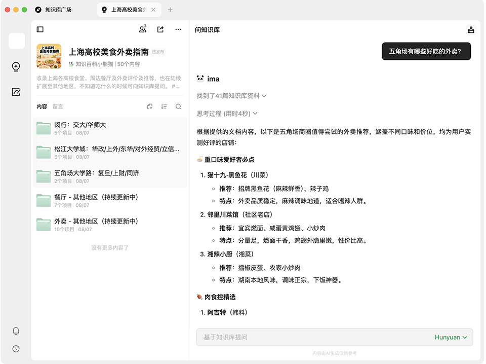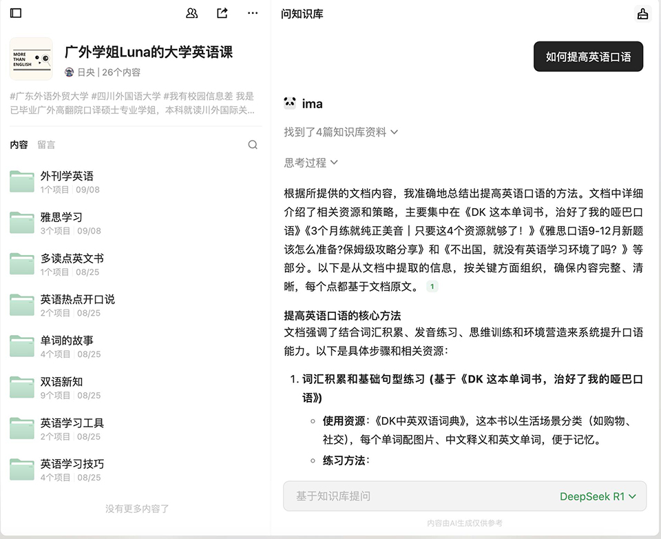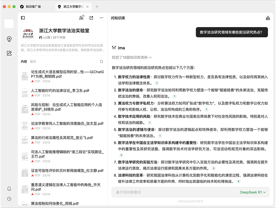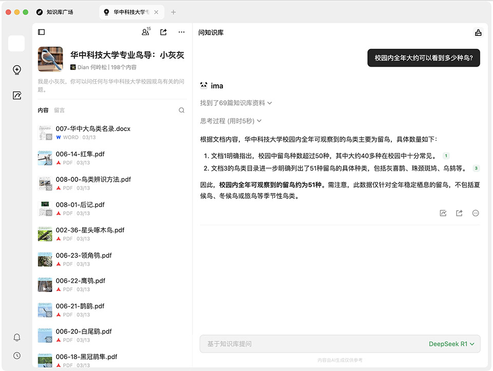 ima是腾讯旗下的AI工作台,以「知识库」为核心特色,并提供“问”“读”“写”智能新体验,目前已接入腾讯混元大模型和DeepSeek R1、V3模型。