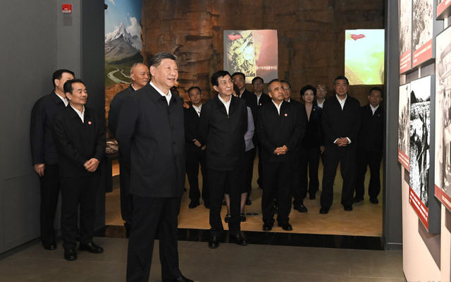 9月24日,抵达新疆第二天,习近平总书记听取新疆维吾尔自治区党委和政府工作汇报,参观新疆维吾尔自治区成立70周年主题成就展,并观看庆祝新疆维吾尔自治区成立70周年文艺晚会。(总台央视记者程铖拍摄) 当天上午,总书记来到乌鲁木齐文化中心展览馆展厅,参观新疆维吾尔自治区成立70周年主题成就展。
