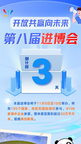 进博会倒计时3天 开放共赢向未来 第八届中国国际进口博览会将于11月5日至10日举办。目前,各项筹备工作已基本就绪,将有155个国家、地区和国际组织参与,4108家境外企业参展,整体展览面积超过43万平方米,规模再创新高。